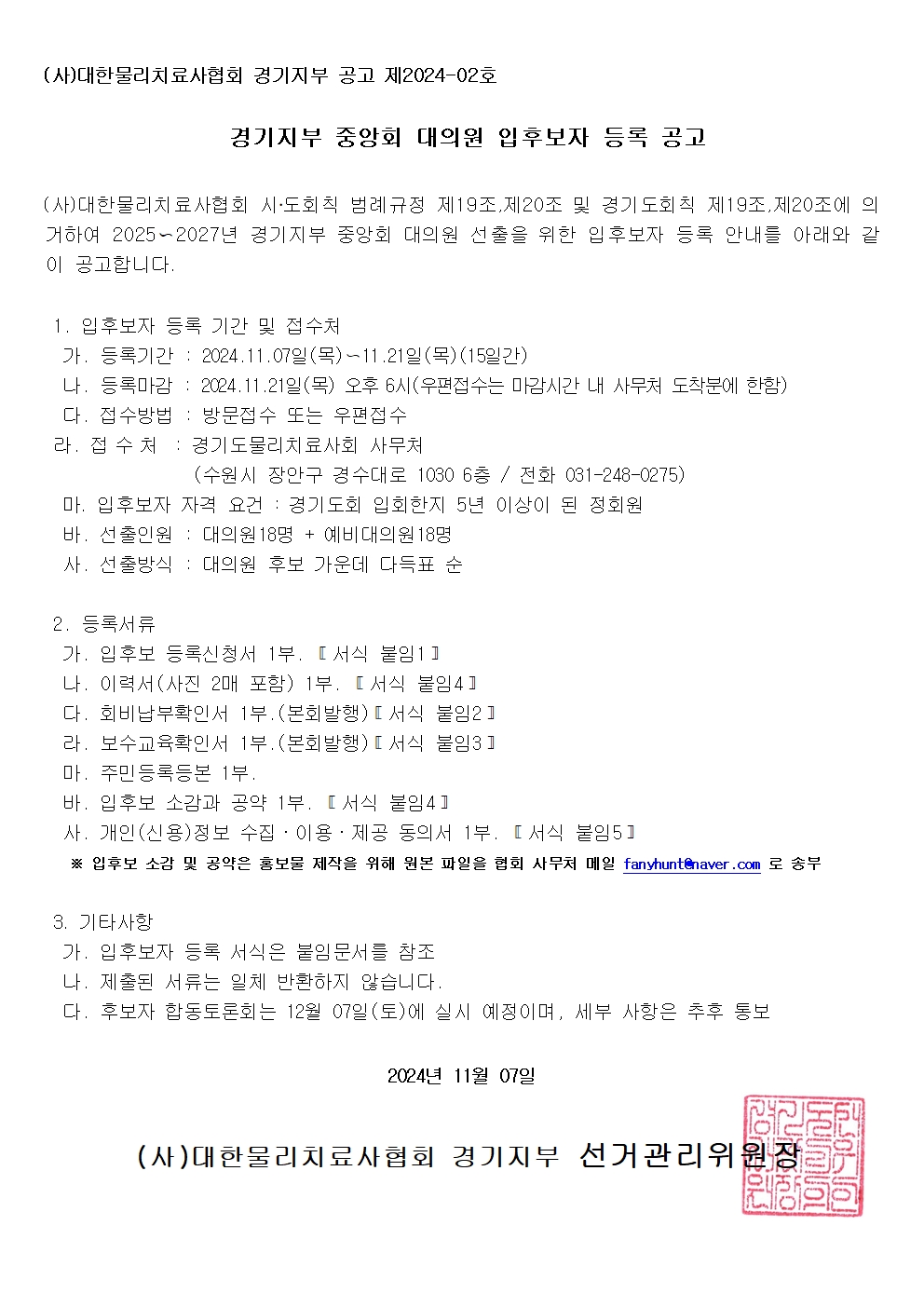 2025년~2027년 경기지부 중앙회 대의원 입후보 등록 공고