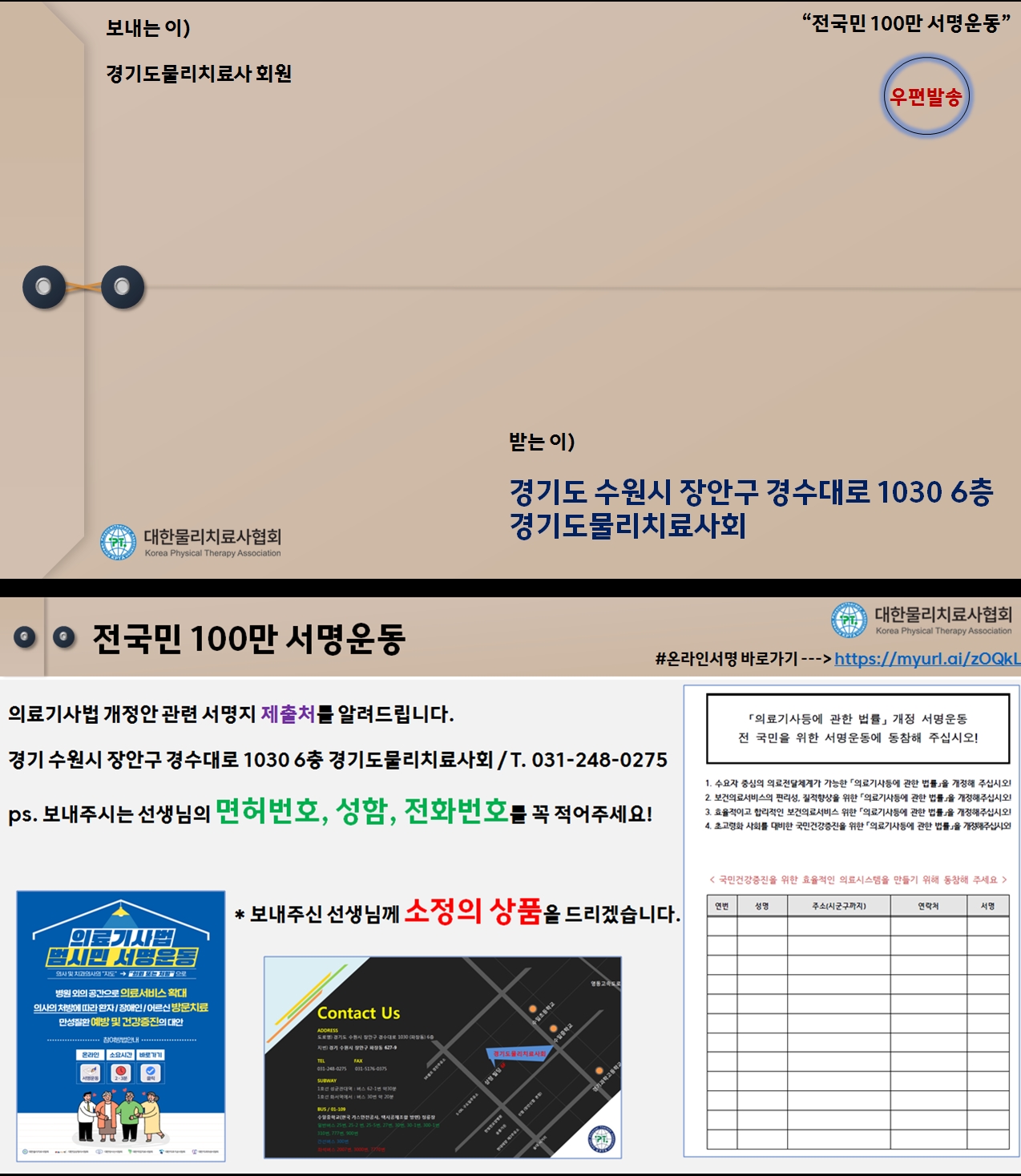 안녕하세요. 경기도물리치료사회 입니다.대한민국 국민의 건강을 책임질 "의료기사 등의 관한 법률 개정" 온라인 서명운동 전 국민을 위한 서명운동에 동참해 주십시오!* 보내주신 선생님께 소정의 상품을 드리겠습니다.* 주소는 시,군,구 까지만 적어주시면 됩니다.* 의료기사법 개정안 관련 서명지 제출처를 알려드립니다.경기 수원시 장안구 경수대로 1030 6층 경기도물리치료사회 T.031-248-0275* 보내주시는 선생님의 면허번호, 성함, 전화번호를 꼭 적어주세요.참여 방법)1. 온라인서명 참여 (https://myurl.ai/zOQkL)2. "2021. 6.18 의료기사법 100만 오프라인 서명운동" 첨부파일 다운로드3. 양식 내용에따라 기재(주소는 시,군,구 까지만 기재)4. 우편을 통해 경기도물리치료사회로 첨부파일 양식지 동봉 후 면허번호, 성함, 전화번호 기재해서 보내기.5. 추 후 선물 수령.