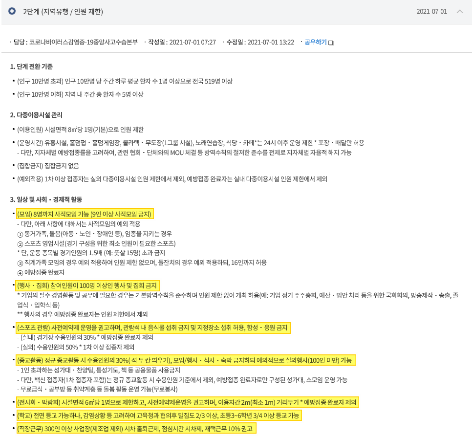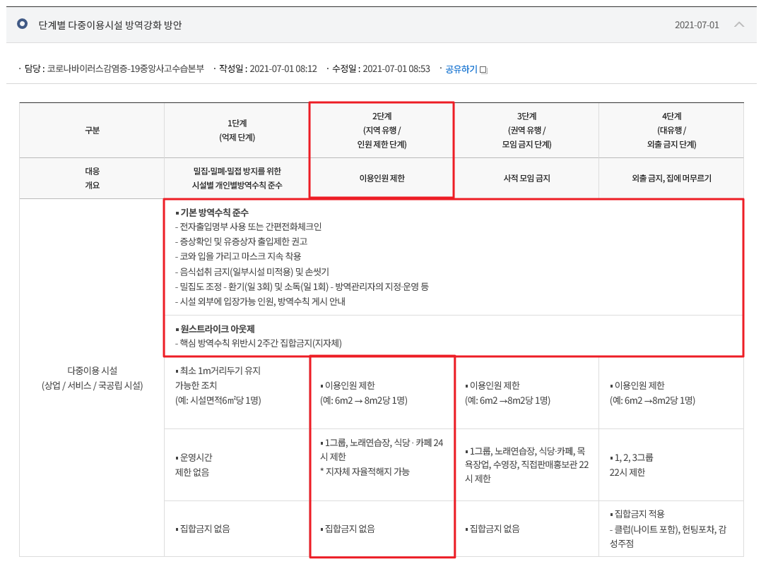 안녕하세요. 경기도물리치료사회 입니다.코로나19 신규확진자가 어제도(07.05) 746명 발생 되었습니다.일주일 연속 700명 이상 확진자가 발생되고 있고, 일주일 연속 700명대 이상 확진자가 나온 것은 3차 유행 직후였던, 작년 연말 이후 처음이라고 합니다."사회적 거리두기 개편안 및 주요 방역수칙" 관련하여 보건복지부 7월1일자 자료를 첨부하오니 방역과 사회적 거리두기에 경기도회원분들께서 많은 동참 부탁드리겠습니다. 감사합니다.