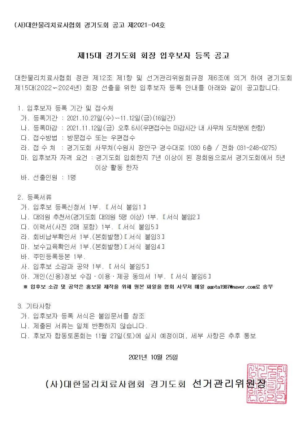 경기도회 중앙회 대의원 입후보자 등록 공고