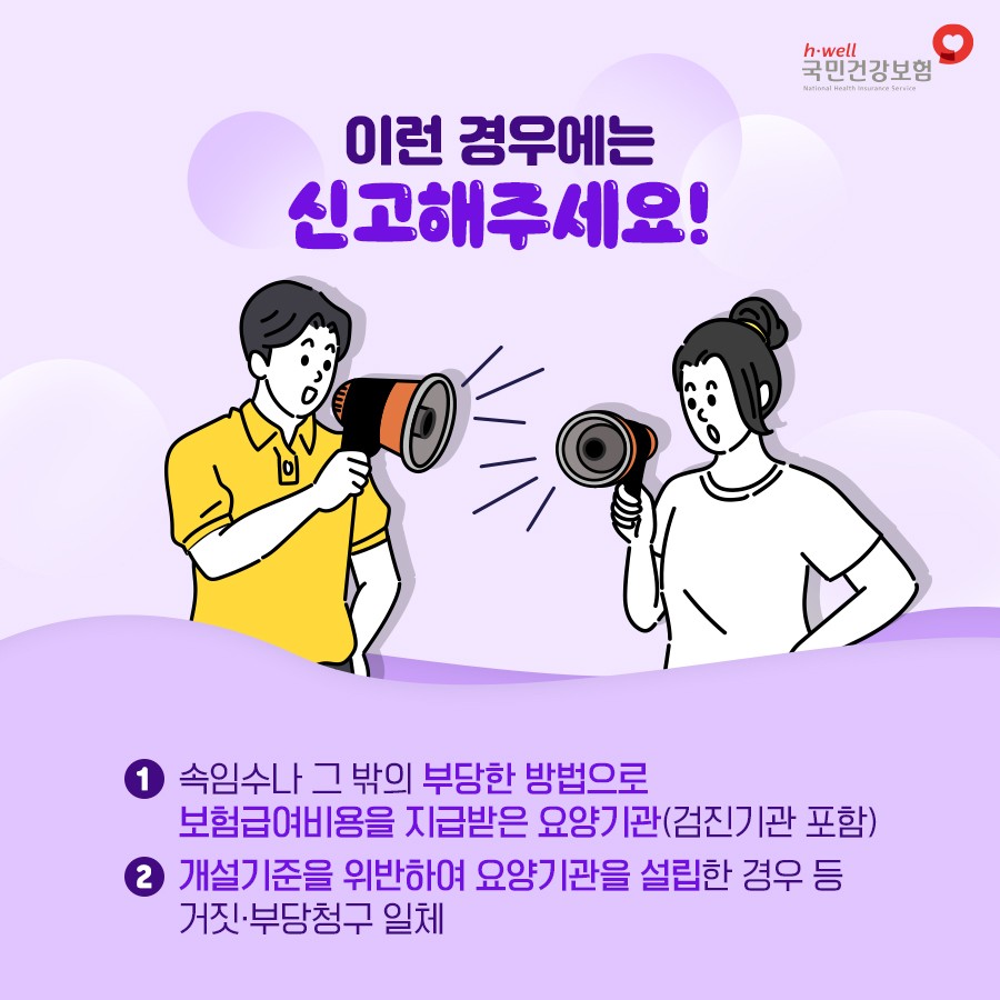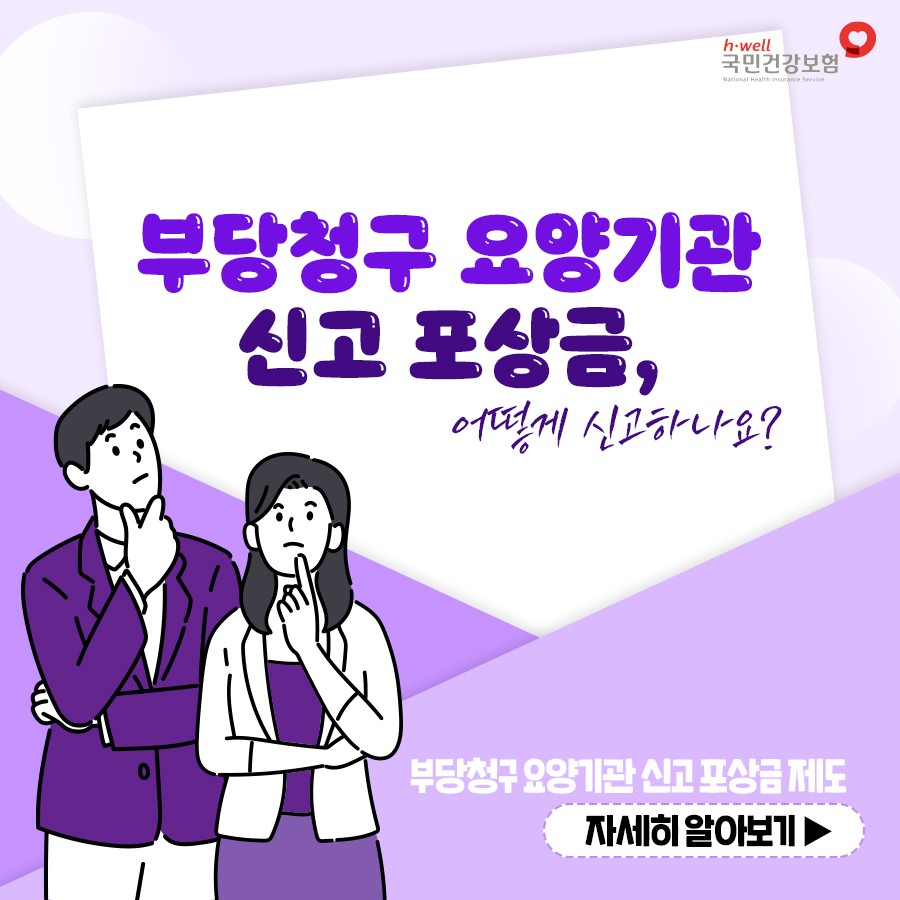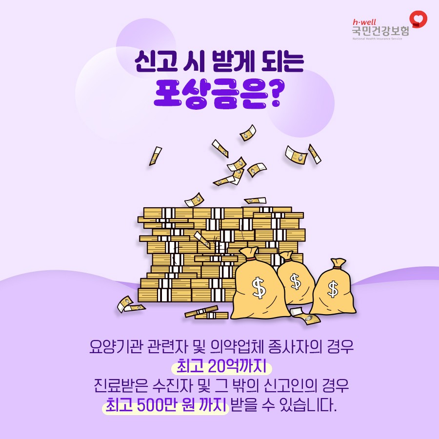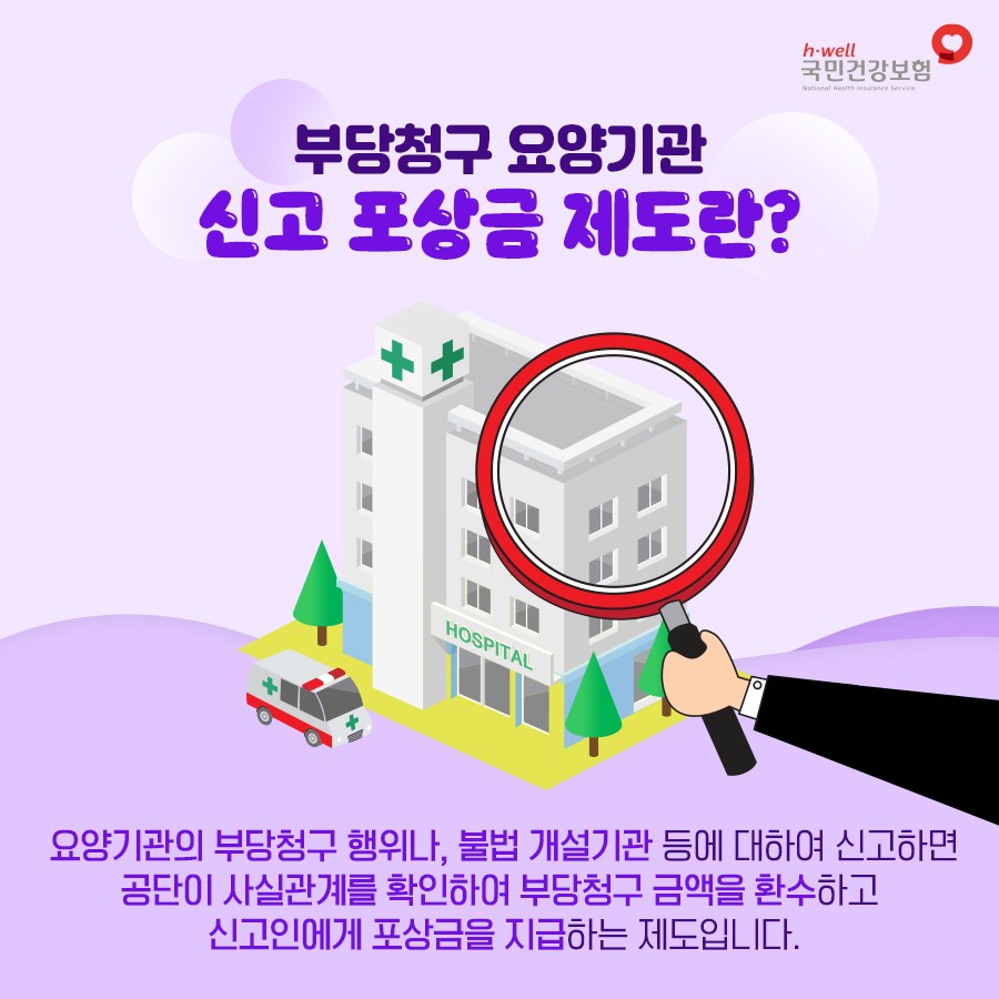 국민건강보험공단에서는 요양기관의 부당청구 행위나, 불법개설기관 등에 대하여 신고하면 공단이 사실관계를 확인하여 부당청구 금액을 환수하고 신고인에게 포상금을 제도를 운영하고 있습니다.